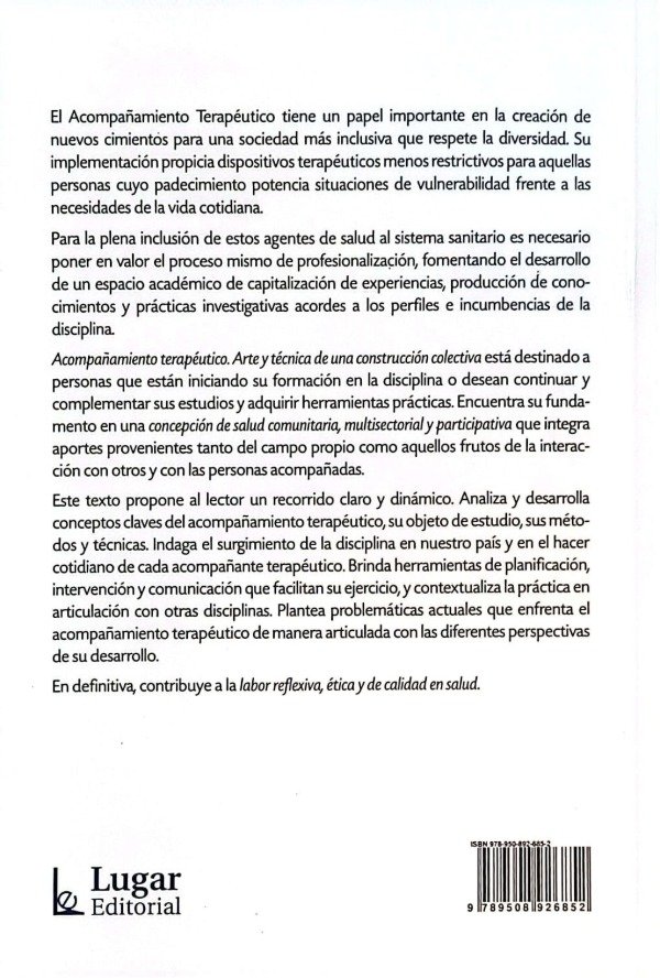 Este material, propone al lector un reccorrido claro y dinámico. Analiza y desarrolla conceptos claves del Acompañamiento Terapéutico, su objeto de estudio, sus métodos y técnicas. Indaga el surgimiento de la disciplina en nuestro país y en el hacer cotidiano de cada acompañante terapéutico. Brinda herramientas de planificación, intervención y comunicación que facilitan su ejercicio y contextualiza la práctica en articulación con otras disciplinas. Plantea problemáticas actuales que enfrenta el acompañamiento terapéutico de manera articulada con las diferentes perspectivas de su desarrollo.