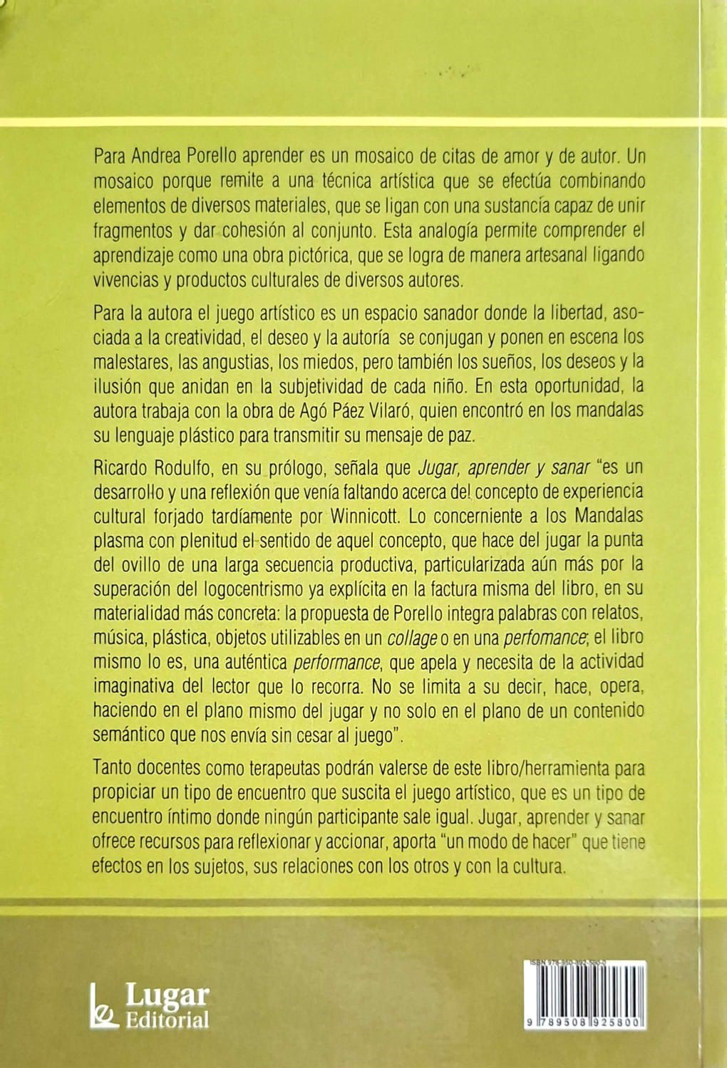 Tanto docentes como treapeutas podrán valerse de este libro/herramienta para propiciar un tipo de encuentro que suscita el juego artístico, que es un tipo de encuentro íntimo donde ningún participante sale igual. Jugar, aprender y sanar ofrece recursos para reflexionar y accionar, aporta "un modo de hacer" que tiene efectos en los sujetos, sus relaciones con los otros y con la cultura.